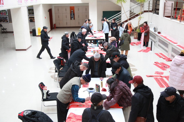 活動現(xiàn)場,紅紙鋪就,墨香氤氳,濃厚的年味撲面而來。書法家們揮灑自如,筆力遒勁,一幅幅充滿吉祥寓意的春聯(lián)和“?!弊周S然于紙。參與活動的老同志們或是駐足欣賞,或是協(xié)助書法家抻紙晾曬,更有不少即興揮毫,相互間品評筆法和韻味。歡聲笑語中,墨寶相贈,技藝切磋,溫情脈脈的互動間,展現(xiàn)了民族團結(jié)的深厚情誼。