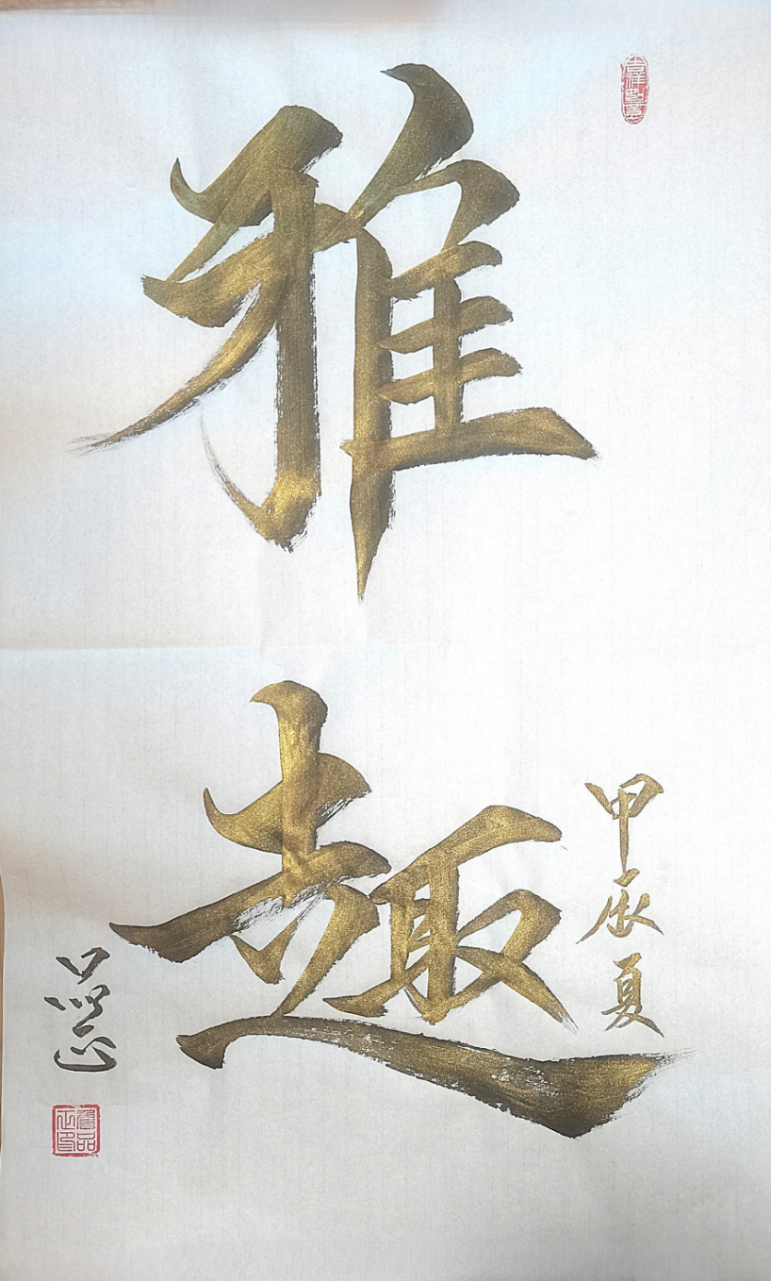 他的作品《雅趣》看似簡(jiǎn)單,實(shí)則厚重凝練,猶如陳釀的美酒,越品越有滋味。他的作品筆畫(huà)轉(zhuǎn)合之間既有對(duì)傳統(tǒng)筆法的精準(zhǔn)把握又有自己獨(dú)特的創(chuàng)新表達(dá)。作品《龍馬》《鴻業(yè)騰飛》中則展現(xiàn)出書(shū)法的雄渾大氣,同時(shí)又不乏飄逸之美。這種濃淡相宜、虛實(shí)相生的筆墨運(yùn)用,讓他的書(shū)法作品充滿(mǎn)了生命力,仿佛大鵬展翅時(shí)攪動(dòng)的氣流軌跡。詹品正的書(shū)法不僅是一種藝術(shù)表現(xiàn)形式,更是他人生價(jià)值的體現(xiàn)。他在書(shū)法創(chuàng)作中所展現(xiàn)出對(duì)藝術(shù)的執(zhí)著追求以及勇于創(chuàng)新的精神,正是他人生態(tài)度的寫(xiě)照。觀眾看見(jiàn)的不只是字的形態(tài),更是一個(gè)藝術(shù)家用毛筆與時(shí)空對(duì)話的生命姿態(tài)。這種在點(diǎn)畫(huà)間灌注靈魂的創(chuàng)作,讓其書(shū)法看起來(lái)充滿(mǎn)神采。