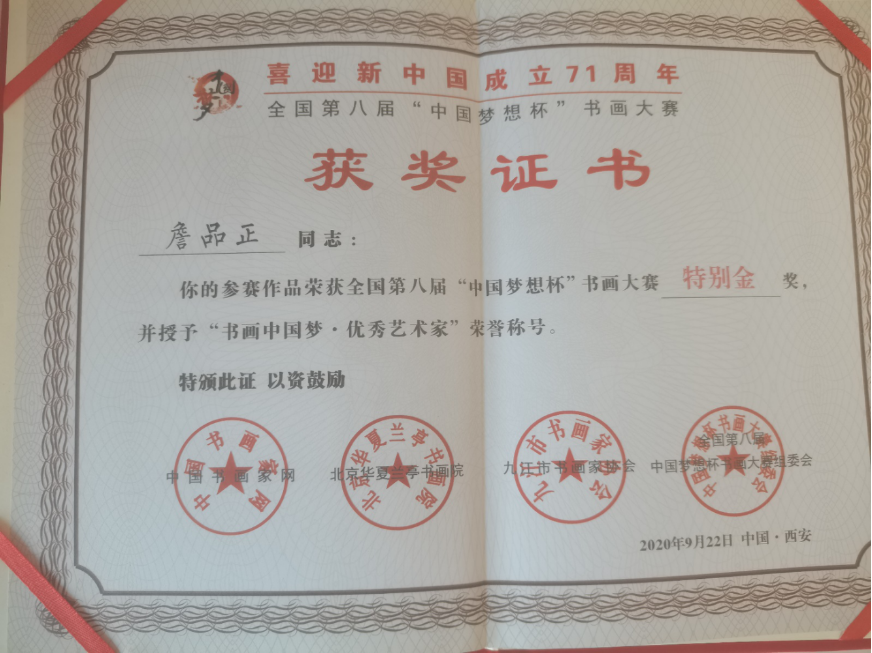 2020年9月書(shū)法作品在全國(guó)第八屆“中國(guó)夢(mèng)想杯”書(shū)畫(huà)大賽中,榮獲特別金獎(jiǎng),并授予“書(shū)畫(huà)中國(guó)夢(mèng)·優(yōu)秀藝術(shù)家”榮譽(yù)稱(chēng)號(hào)。