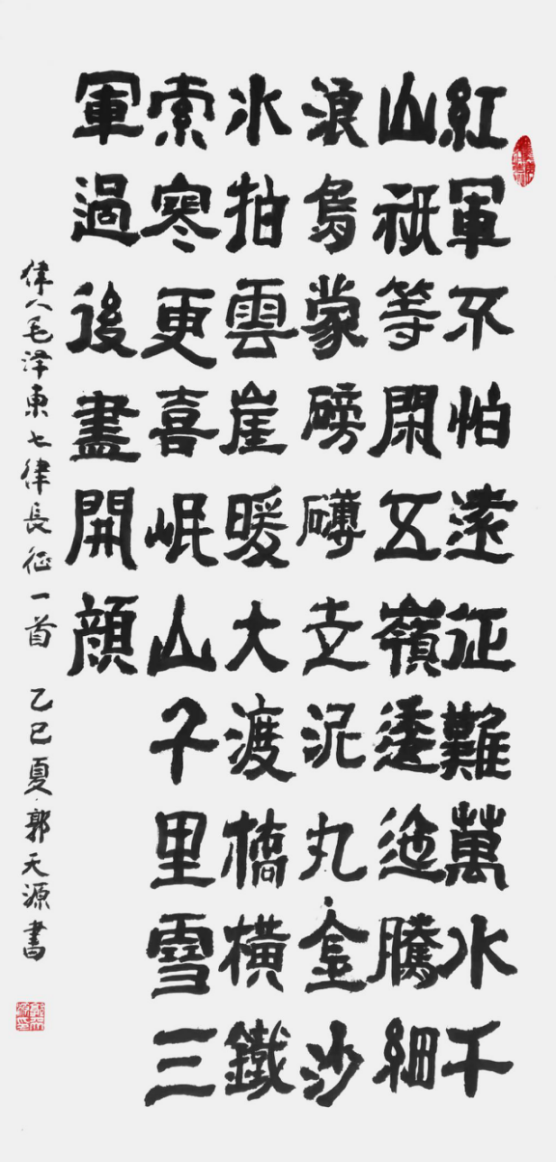 多年來(lái),郭天源先生堅(jiān)守書(shū)法藝術(shù)初心,注重紅色文化與書(shū)法藝術(shù)的融合傳承。2025 年中秋,其作品入選由湖南文人書(shū)畫(huà)院主辦的 “紀(jì)念毛主席《七律長(zhǎng)征》創(chuàng)作 90 周年暨紅軍長(zhǎng)征勝利 90 周年全國(guó)書(shū)畫(huà)交流展”,并獲頒 “中華紅色功勛藝術(shù)家” 榮譽(yù)稱(chēng)號(hào),以筆墨致敬長(zhǎng)征精神,傳遞紅色文化力量。