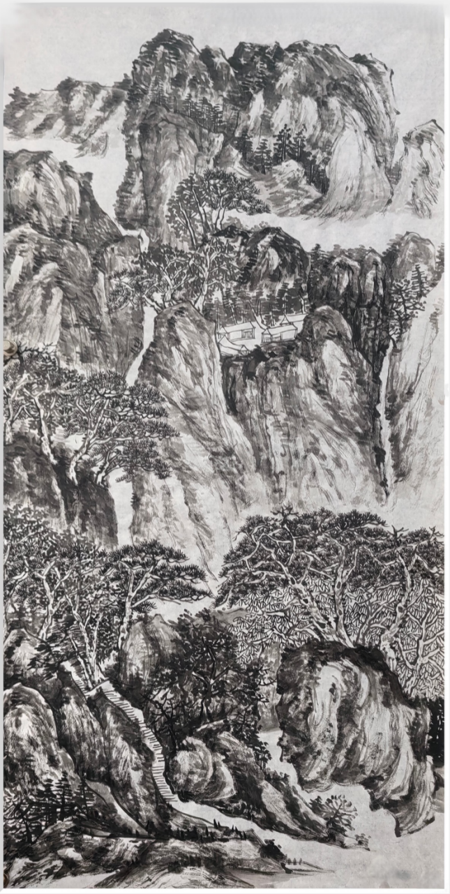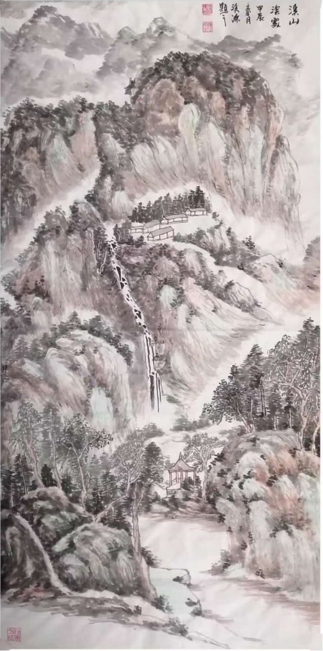 相較于花鳥畫的靈動精微,于利勛的山水畫則盡顯河洛山河的雄渾氣象,其代表作《春山品茗》中,他以“高遠(yuǎn)法”刻畫險峻山巒,山石以濃墨重筆皴擦,借鑒范寬“雨點皴”的厚重質(zhì)感,凸顯龍門石窟周邊山巒的蒼勁風(fēng)骨;中景以淡墨渲染云霧,使山水在虛實之間盡顯層次;遠(yuǎn)景則以留白營造天際的遼闊,讓伊洛河的蜿蜒流淌隱于煙嵐之中,達(dá)成了“咫尺山林,萬里江天”的藝術(shù)效果。在筆墨技法上,于利勛深諳“書畫同源”之道,將河洛書法的骨力融入繪畫線條之中。這種文脈滋養(yǎng)讓他的山水線條兼具遒勁與靈動之美一一勾勒山石時,線條如魏碑般沉雄有力;描摹流水時,筆觸似行書般流暢自然。于利勛的創(chuàng)作無疑踐行了這一藝術(shù)宗旨。他的花鳥,是對自然生命的細(xì)膩體悟,更是對民俗溫情的生動傳遞;他的山水,是對河洛山河的精準(zhǔn)描摹,更是對地域文化根脈的深刻守望。