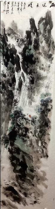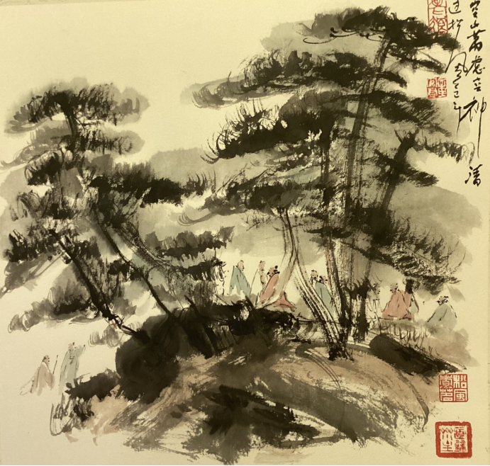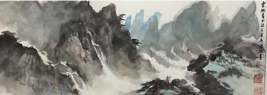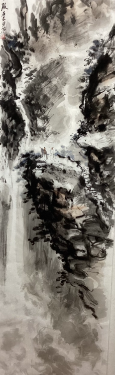 他和鄉(xiāng)友書畫家岑其有過一次《佛道禪心》聯(lián)展,這次展覽非帝成功,而且岑其先生的學(xué)識和藝術(shù)修養(yǎng)對他有極大幫助,這個使他藝術(shù)之路走上了一個新臺價。細(xì)觀章安君的山水畫卷,會發(fā)現(xiàn)一個鮮明的精神標(biāo)識:在蒼茫云水之間,總有一組或三二高士,或觀瀑沉吟,或臥石靜思,或雅集論道?!爱嬌剿耐c景人物畫不好,我的山水往往有一組或三、二高士……這些人物我反復(fù)畫了幾千個爛熟與心?!?nbsp;這種對“人”的執(zhí)著,源于他內(nèi)心深處“天人合一”的哲學(xué)追慕。在他看來,山水是天地之骨,而人物是山水之魂。那些重復(fù)了數(shù)千次的高士,不是簡單的點景符號,而是他將個體生命置于浩渺宇宙中進(jìn)行觀照的媒介,在千巖萬壑間完成人與天地精神相往還的對話。