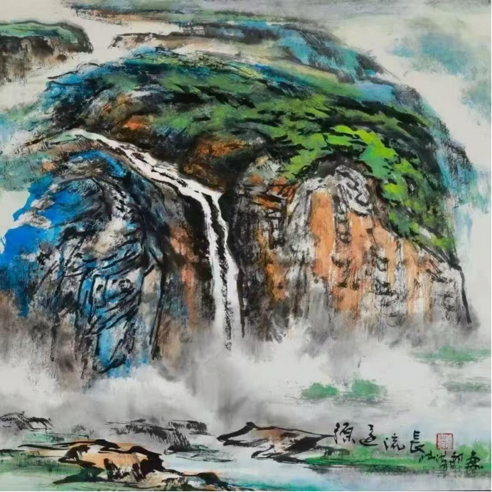 他對藝術(shù)的思考,早已超越了技法的層面,進(jìn)入了“為什么畫”的哲學(xué)追問。在創(chuàng)作環(huán)保題材作品《長江泛青煙》時,他為了表達(dá)習(xí)近平總書記“綠水青山就是金山銀山”的科學(xué)論斷,精心構(gòu)思:畫面上將長江置于上方且向東流,寓意“一江碧水向東流”的戰(zhàn)略目標(biāo);將石頭意象化為候鳥,帶著感恩的心態(tài)遠(yuǎn)眺首長的考察船。在技法上,他不僅運(yùn)用傳統(tǒng)的勾皴擦點(diǎn)染,還大膽借鑒西畫的透明薄涂和不透明厚涂法,生動展現(xiàn)出綠茵江邊與懸崖苔蘚的生態(tài)效果。這種將宏大敘事與精微技法結(jié)合的創(chuàng)作方式,讓他的作品充滿了時代感。
