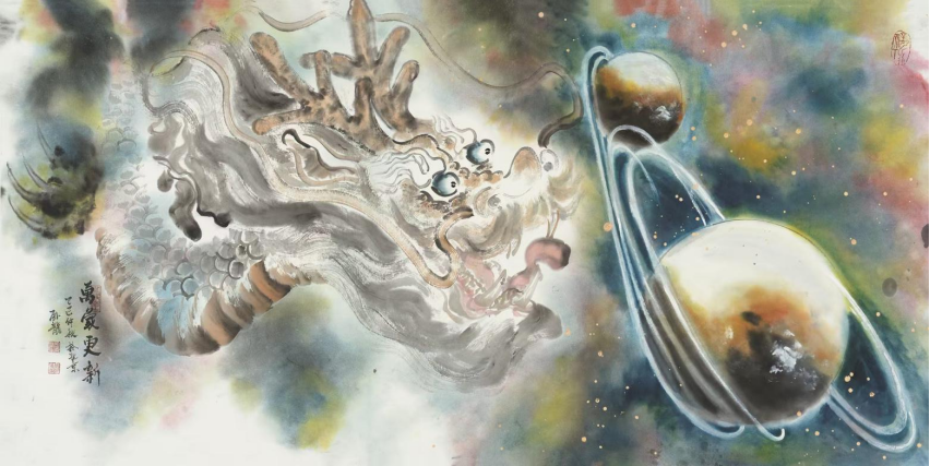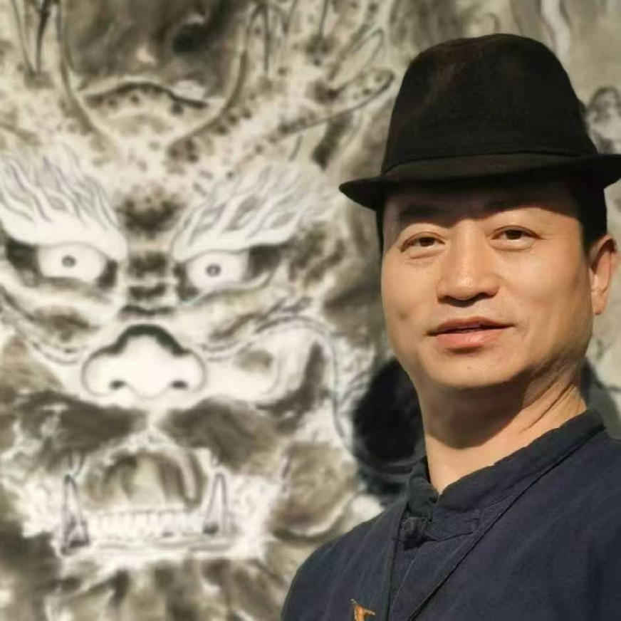 其藝術(shù)最具標(biāo)識(shí)度者,當(dāng)屬墨龍。他畫龍,不取怪誕張揚(yáng),而重神韻氣度。以中鋒立骨,線條遒勁如篆籀,墨色淋漓厚重;構(gòu)圖開合大氣,或騰云駕霧,或靜臥藏鋒,將中華龍文化的威嚴(yán)、祥瑞與自強(qiáng)不息之精神,熔鑄于尺幅之間。作品既有《山海經(jīng)》神話意象,又具當(dāng)代審美格局,形神兼?zhèn)洹鈩?shì)磅礴,被譽(yù)為當(dāng)代畫龍代表性人物,真正做到“以筆為骨、以墨為魂,以龍載道、以藝傳情”。