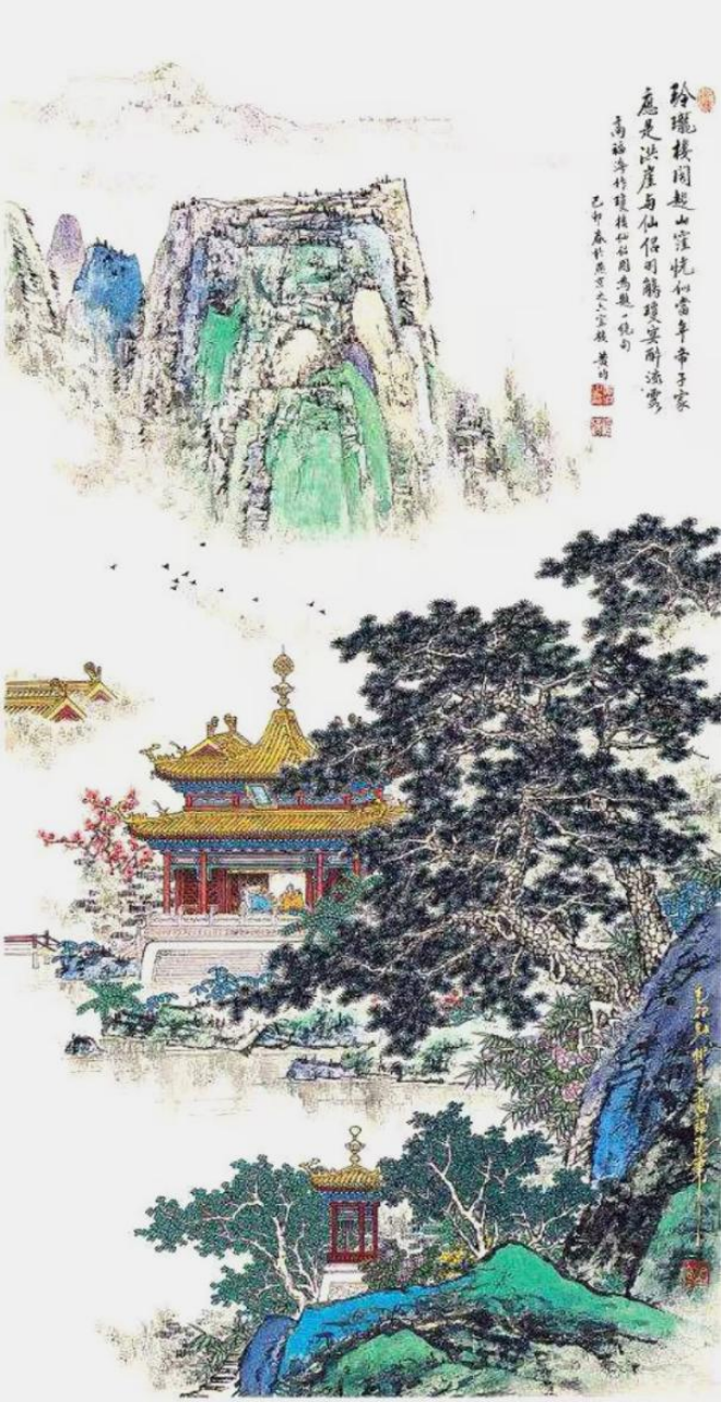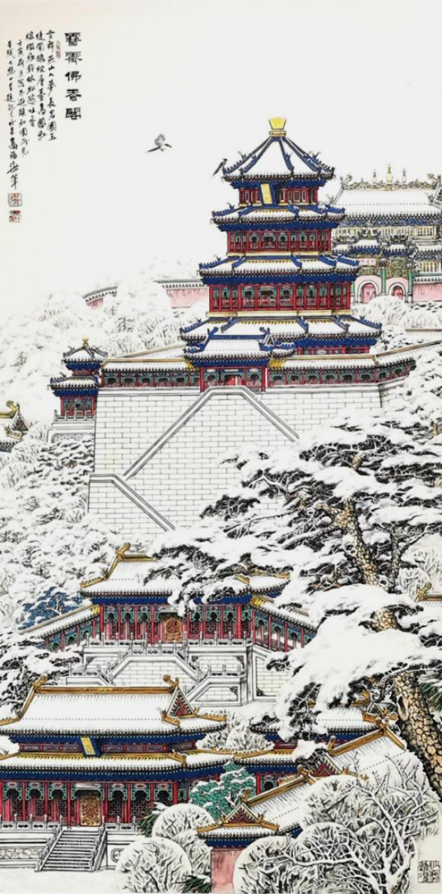 《青城山》層巒疊峰,林木蔥郁,縱橫有序,錯綜多姿。構圖嚴謹,筆墨渾厚華滋,以石青石綠著色點染,展示出山中的幽趣,全圖煙云流潤,氣勢雄偉,系高福海界畫的杰作之一?!度鹧情w》《雪霽佛香閣》所繪景色白雪皚皚,雄巒入云,高峰對峙,千巖萬壑;寒林深處掩映著樓臺殿閣,錯落有致,靜謐幽森,具高遠平遠深遠之境,表現(xiàn)出大自然的雄偉氣勢。尤其是瑞雪的表現(xiàn)技法,不畫一筆白粉,靠墨與色反復積染皴擦,擠出白雪的意境來,難度極大,堪稱一絕。