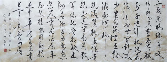 他從青年時起,在毛主席書法藝術(shù)的引領(lǐng)下與翰墨結(jié)緣,在三十多年的學(xué)習(xí)過程中邊學(xué)邊悟,廣學(xué)百家之長,熔經(jīng)典和現(xiàn)代為一爐,集清秀與豪放為一體,將秀美元素融入雄渾豪放的毛體書法,在對傳統(tǒng)毛體書法的風(fēng)格重塑中,創(chuàng)立了別具魅力的“新時代毛體書法”。