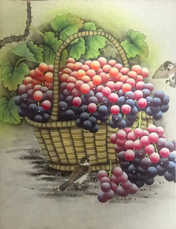 工筆畫是賀天飛藝術的重要語言,尤其在《葡萄松鼠》《荔枝小鳥》《青綠葫蘆》等作品中,其細膩的筆觸與嚴謹?shù)脑煨土钊梭@嘆。如《葡萄松鼠》中,多串葡萄以淡粉、深紫、藍紫分層渲染,每顆葡萄表面的水珠用留白法點綴,既保留了工筆“窮工極妍”的特質(zhì),又通過“水珠”的透明感賦予葡萄“剛被雨水滋潤”的鮮活;松鼠的黃褐毛發(fā)以細筆攢點,背部黑白條紋的漸變處理,連爪子的肉墊都清晰可辨——這種“形似”的追求,最終服務于“神似”的表達:松鼠仰頭的靈動、葡萄垂掛的飽滿,共同傳遞出“自然生機”的核心意象。