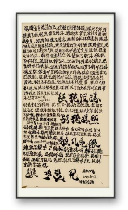 日積月累的練習(xí),讓劉勇形成了獨(dú)具特色的書法風(fēng)格。他的書法作品布局精妙,字行茂密緊湊卻密中見疏,墨色枯潤相間打破密集感,標(biāo)題筆墨夸張醒目,與正文的細(xì)膩形成強(qiáng)烈反差,整體統(tǒng)一中充滿張力。線條蒼勁靈動(dòng),起筆側(cè)鋒切入,行筆提按頓挫分明,粗細(xì)對(duì)比強(qiáng)烈,既兼具碑學(xué)的雄渾力道,又蘊(yùn)含帖學(xué)的流暢意韻,完美詮釋了 “以書載文、以筆抒情” 的創(chuàng)作理念。