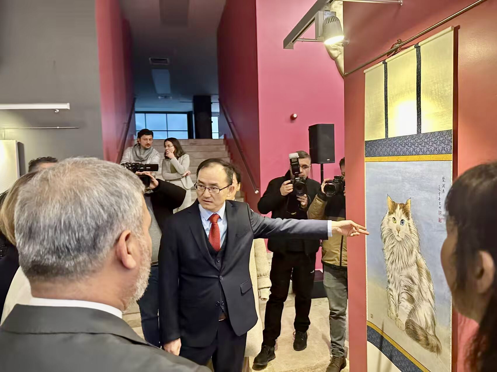 姜學(xué)斌大使親自向嘉賓親自講解李昱春教授參展作品。中外嘉賓紛紛在李教授畫作前駐足欣賞,大家紛紛表示,李教授創(chuàng)作的畫作凸顯“對(duì)話·共融”主題,既有文明傳承又展現(xiàn)了奮發(fā)進(jìn)取的時(shí)代精神,在美學(xué)、美育上與偉大的土耳其文明產(chǎn)生了共鳴,為中土友誼和中土文明交流互鑒注入了澎拜的藝術(shù)力量。