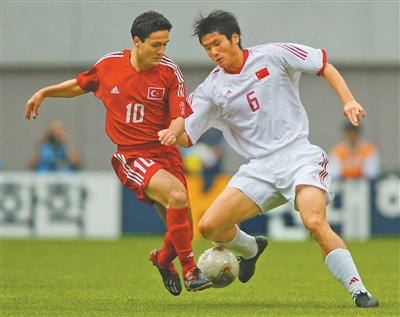 2002年韓日世界杯小組賽,中國隊對陣土耳其隊,邵佳一(右)在比賽中拼搶。影像中國