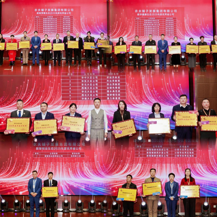 市場(chǎng)頒獎(jiǎng)環(huán)節(jié)將現(xiàn)場(chǎng)氛圍推向新的高潮。集團(tuán)董事長(zhǎng)袁道紅親自為農(nóng)夫鋪?zhàn)悠叽髤^(qū)域負(fù)責(zé)人頒發(fā)獎(jiǎng)項(xiàng),肯定他們?cè)谌珖?guó)市場(chǎng)開拓與戰(zhàn)略落地中的關(guān)鍵作用。隨后,各業(yè)務(wù)生態(tài)體系分別展開表彰:數(shù)智零售、數(shù)智健康紅盟、數(shù)智健康小視號(hào)及數(shù)智創(chuàng)業(yè)四大板塊的生態(tài)負(fù)責(zé)人,依次為表現(xiàn)卓越的省級(jí)、市級(jí)、區(qū)縣級(jí)公司授予榮譽(yù)。每一輪頒獎(jiǎng)都伴隨著熱烈的掌聲,這不僅是對(duì)過往成績(jī)的認(rèn)可,更是對(duì)一線奮斗者扎根區(qū)域、深耕市場(chǎng)的生動(dòng)致敬。獎(jiǎng)項(xiàng)與笑容交相輝映,凝聚成農(nóng)夫鋪?zhàn)由鷳B(tài)共贏、同心共進(jìn)的力量圖景。