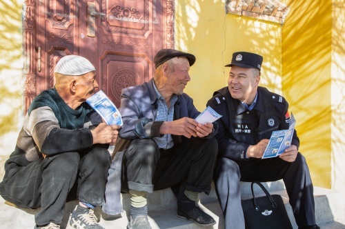 沙帕爾?艾力坎木與民警為轄區(qū)群眾提供便民服務