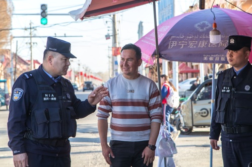 沙帕爾?艾力坎木與民警在轄區(qū)商鋪開展走訪排查工作