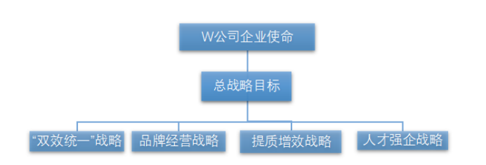 W公司具體戰(zhàn)略目標(biāo)分為四個(gè)方面:“雙效統(tǒng)一”;品牌經(jīng)營(yíng);提質(zhì)增效;人才強(qiáng)企。